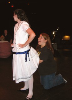 Mrs. Paroo pantomimes signing my imaginary pad in rehearsal. We had props for the show.