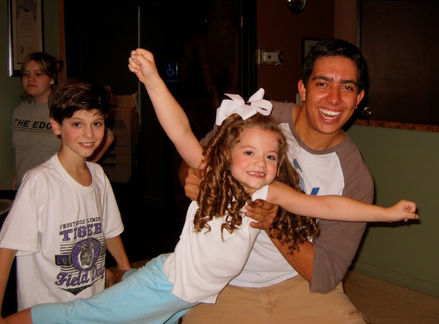 David Escoto (right) and Jeremy Tushnet fly Lacy Tushnet around the green room.